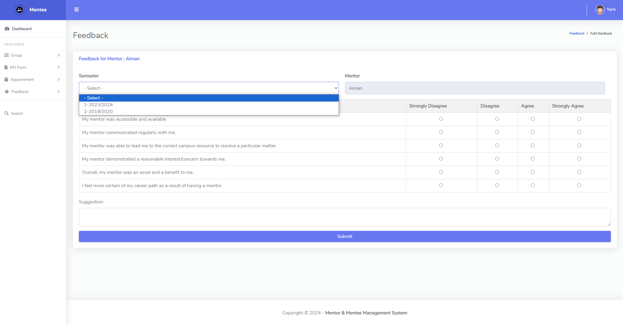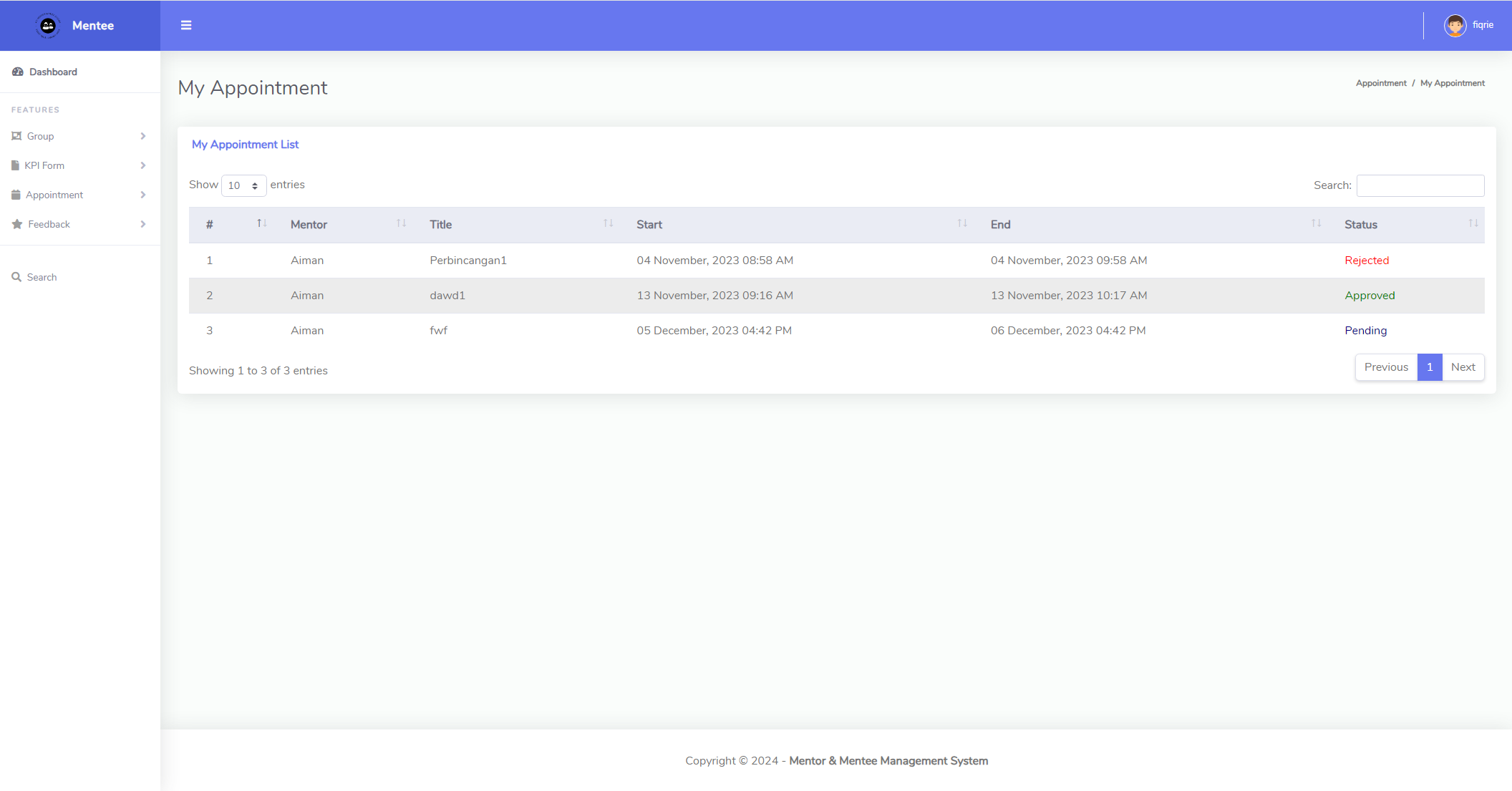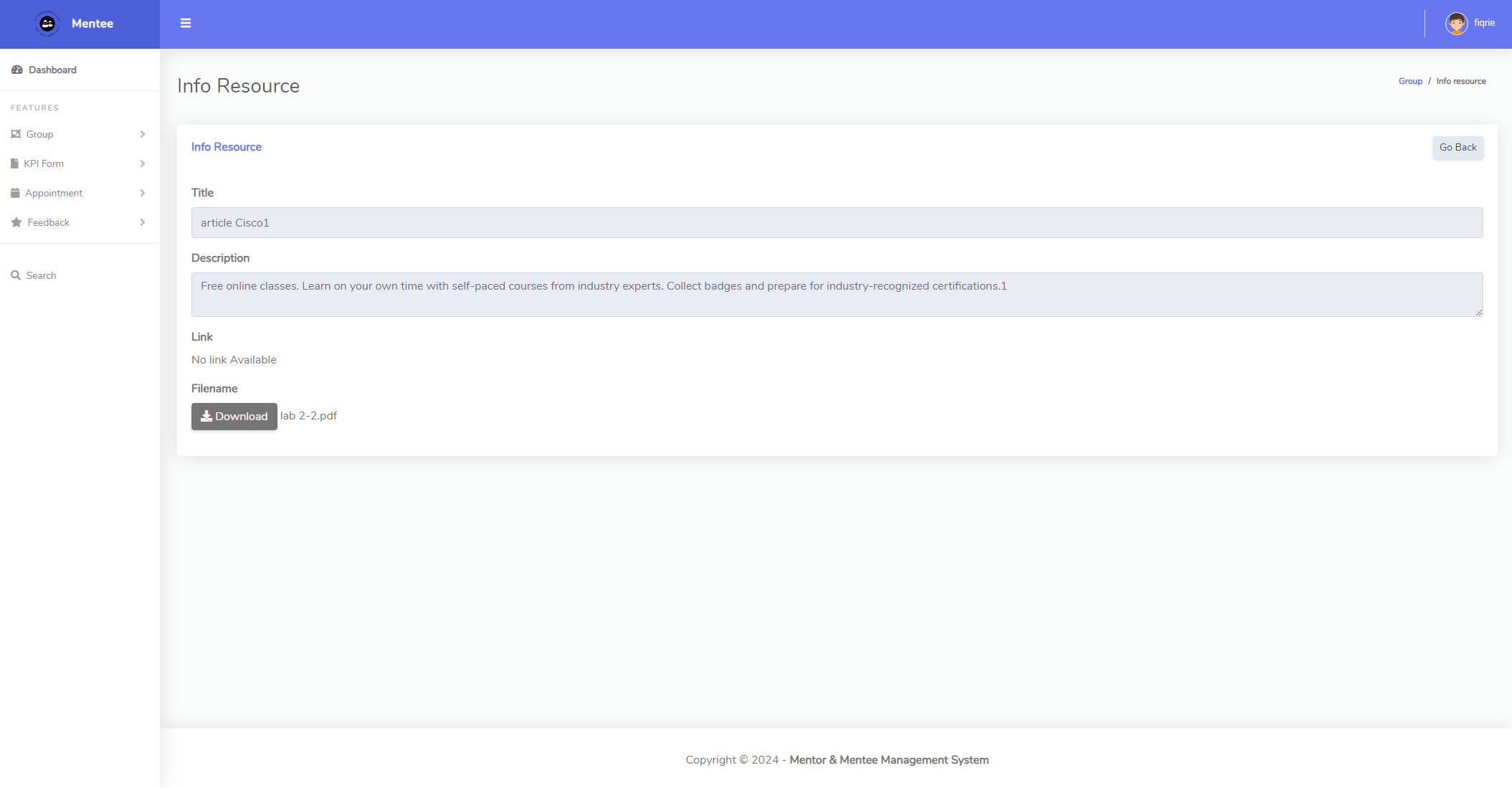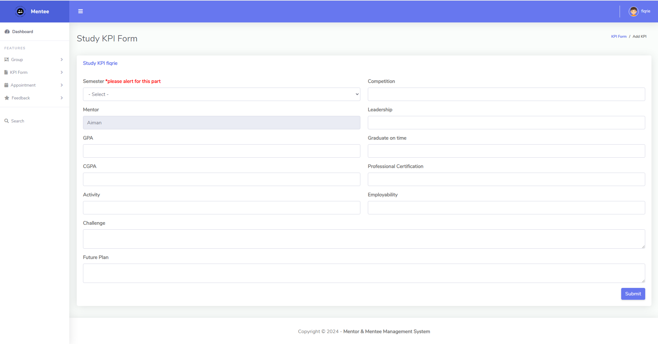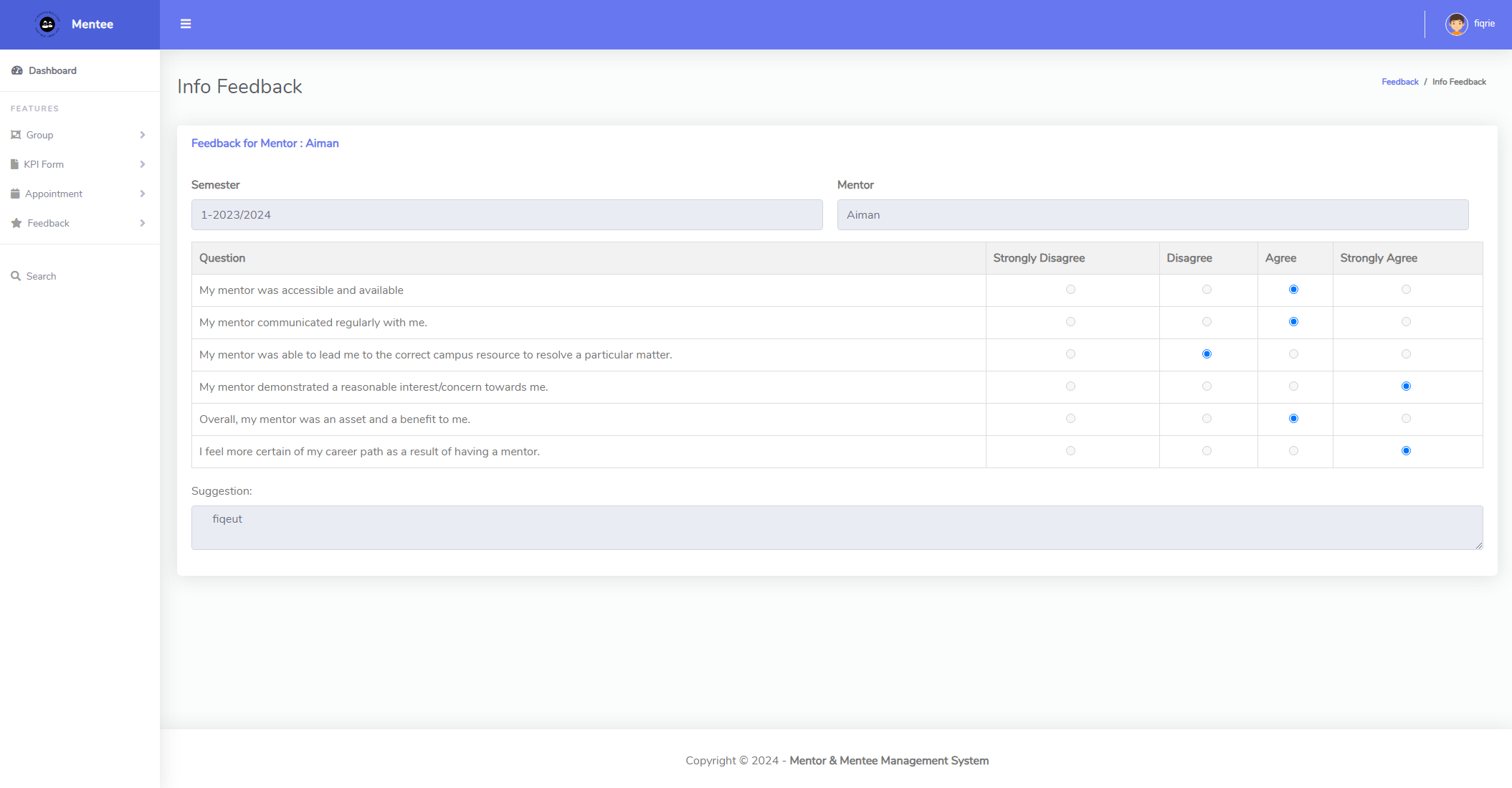This project includes features such as online Key Performance Indicator (KPI) uploads, booking appointments to meet with mentors, and a group section for discussion and viewing resources provided by mentors. Additionally, there is a function for evaluating mentors for the semester. Mentors can also provide feedback on KPIs and offer advice through the group. Implementing this system aims to propel FCI towards Industry 4.0, transitioning from manual mentor and mentee documentation via PDFs.